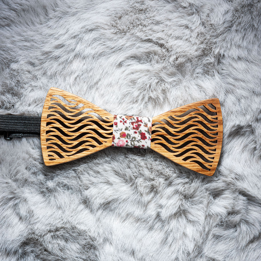Diese extravagante Fliege kombiniert fein gelasertes Holz in warmer, naturbelassener Optik mit einem floralen Mittelstück. Der Name „Wildwood“ verweist auf die wilde, natürliche Schönheit des Materials, während „Blossom“ den floralen Kontrast und die zarte Verspieltheit des Stoffelements hervorhebt. Ein kreativer Mix aus Natur, Design und Eleganz – perfekt für stilbewusste Individualisten mit Sinn für das Besondere.